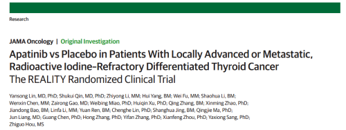 2021年12月16日,权威医学杂志《JAMA Oncology》(影响因子31.777)在线发表阿帕替尼的一项III期临床研究(REALITY)——甲磺酸阿帕替尼片治疗局部进展/转移性放射性碘难治性分化型甲状腺癌(RAIR-DTC)患者的多中心、随机、双盲、安慰剂对照临床研究。此研究由北京协和医院的林岩松教授和南京金陵医院的秦叔逵教授发起,在全国21个研究中心展开,由利来医药中央医学事务部团队支持完成。